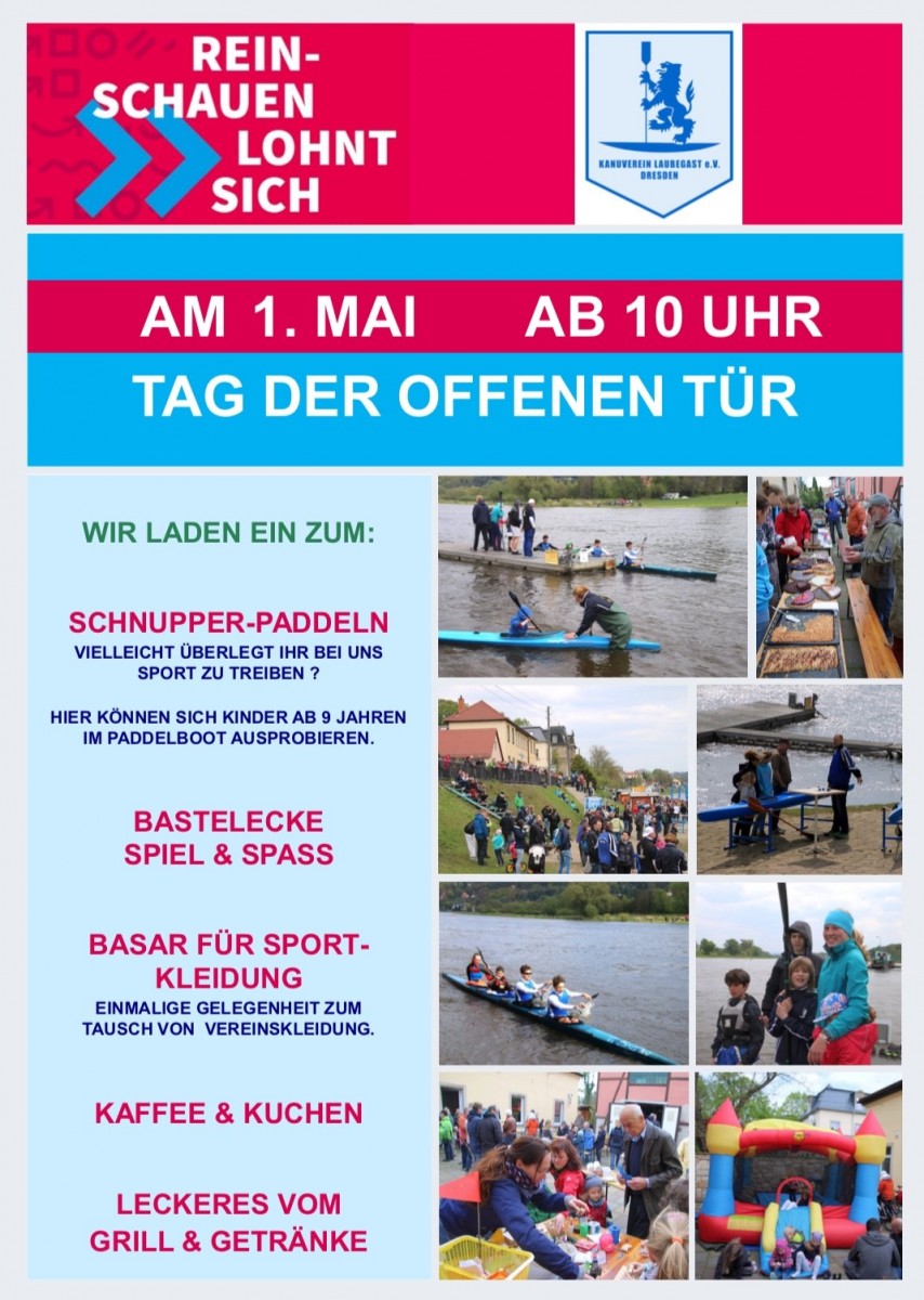 Zum Tag der offenen Tür am 1. Mai lädt der KVL e.V. alle Freunde des Wassersportes herzlich ein. Ab 10 Uhr können die Schnupperpaddler (Kinder und Jugendliche ab 9 Jahren) gemeinsam mit den erfolgreichen Rennkanuten des KVL e.V. testen, ob Kanurennsport eine Sportart ist, die sie interessiert.