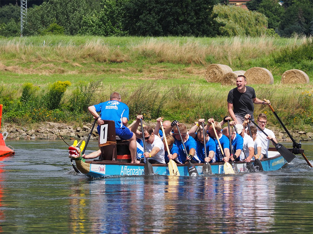 Da in den letzten Jahren das Inselfest mitten in den Sommerferien lag, hatten wir unseren Laubegastcup Ende September durchgeführt. In diesem Jahr passte der Termin wieder besser und so nutzen wir das bunte Treiben als kulturellen Rahmen für die inzwischen schon 11. Auflage unserer Veranstaltung. Mein Dank an den Inselfestverein für die prima und unkomplizierte Zusammenarbeit! So konnten wir die Bühne unterhalb unseres Bootshauses samt Technik für unser Ziel nutzen. „DJ 207“ sorgte auch dieses Jahr für eine spannende Kommentierung. Am Start waren 9 Teams, wovon die Prag Dragons erneut die weiteste Anreise hatten. Ermittelt wurden die Besten zum Einen über 200m. In der Kategorie Fun erkämpften die Oberflächendrachen den Sieg, gefolgt von HTW Dresden, DraDreZi, Paddelaffen, Profis am Bau und dem Badmeisterteam. In der Kategorie Sport wurde der Sachsenmeister gekürt. Glückwunsch an die Blue Wonder Dragons. Den zweiten Platz belegten die Prag Dragons vor den Paddlern von Intheegarten (einer Renngemeinschaft unserer beiden Firmenteams).