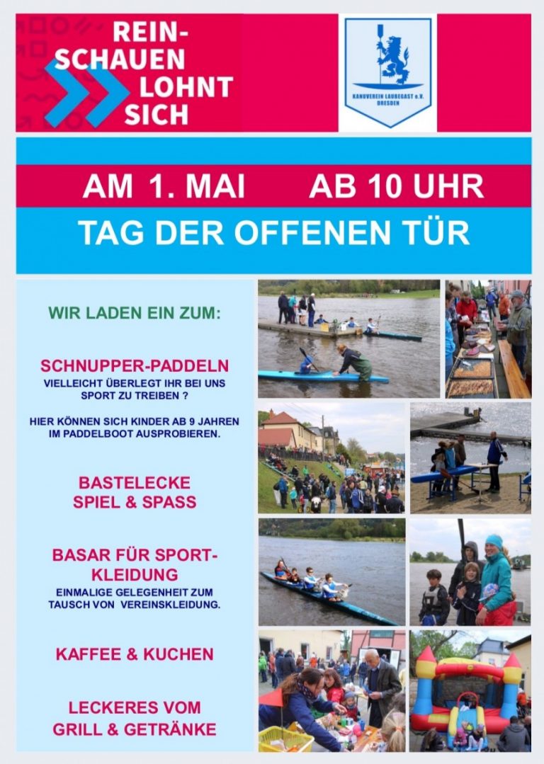 Tag der offenen Tür im KVL e.V. Wann : 1. Mai Zeit: 10:00 Uhr – 15:00 Uhr Wo: Kanuverein Laubegast, Laubegaster Ufer 35 Zum Tag